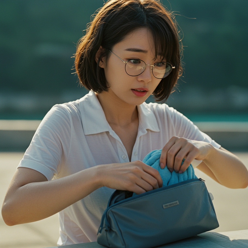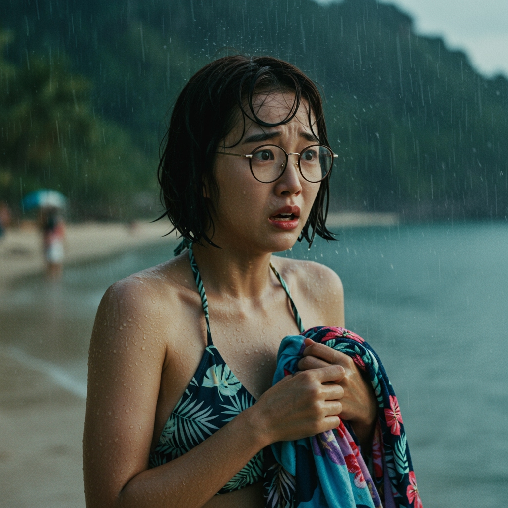 근데 갑자기 비가 쏟아지더니... 아, 젠장. 젖은 수영복이랑 수건은 어떻게 해야 해?